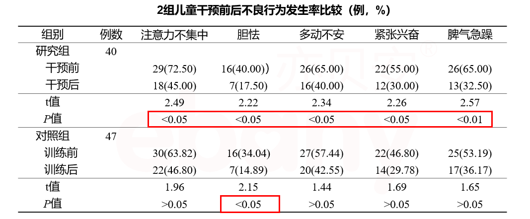 干预治疗6个月后比较两组儿童感觉统合能力、不良行发生率 、注意力缺陷程度。