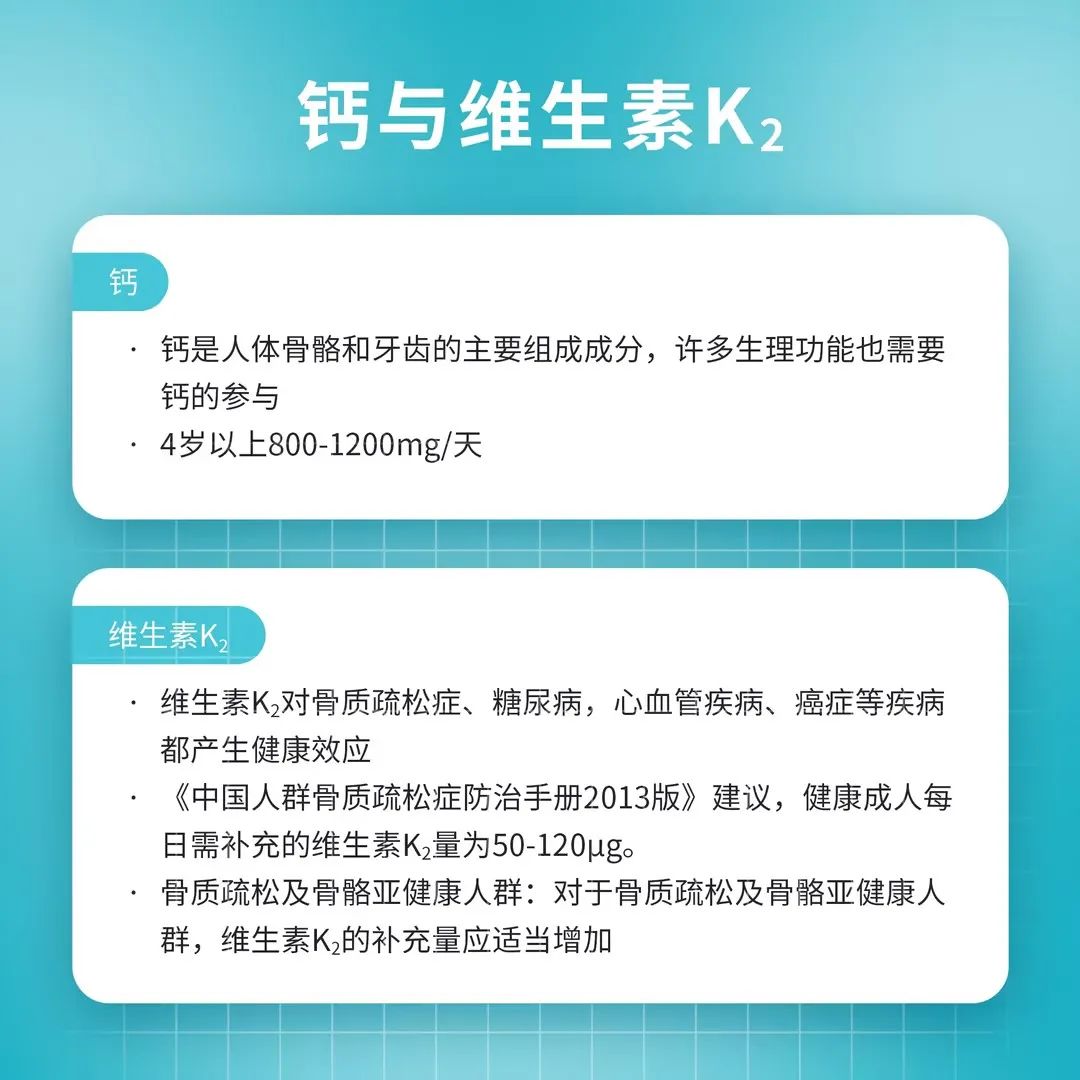 无论是准妈妈们在孕期和哺乳期为自身和宝宝的健康着想,还是家长们希望助力孩子在成长过程中拥有坚实的骨骼基础,亦或是老年人想要维持骨骼健康、预防骨质疏松,这款钙 K 软胶囊都是理想的选择。我们致力于为您的家庭带来全面、有效的营养支持,让您的家人每一个阶段都充满健康活力。